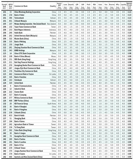 Bank of China (Hong Kong) là ngân hàng được đánh giá mạnh nhất nhưng quy mô tài sản chỉ đứng thứ 31; tương tự ICBC Hong Kong xếp thứ hai về sức mạnh nhưng xếp thứ 231 về quy mô tài sản. Trong khi đó, ICBC và China Construction Bank Corporation của Trung Quốc tuy dẫn đầu về quy mô tài sản nhưng chỉ đứng thứ 7 và thứ 10 khi đánh giá về sức mạnh.