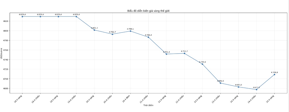 Tuy nhiên, sau đó giá chịu áp lực bán mạnh, trong đó phiên thứ Ba ghi nhận đợt lao dốc mạnh nhất tuần khi vàng mất hơn 2%, rơi xuống mức thấp nhất tuần gần 4.672 USD/ounce khoảng 30 phút trước khi thị trường chứng khoán Bắc Mỹ đóng cửa.