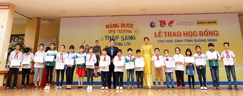 Đại sứ nhân ái Nam A Bank – Hoa hậu H’Hen Niê trao học bổng cho học sinh hiếu học tại hành trình "Nâng bước đến trường - Thắp sáng tương lai”.
