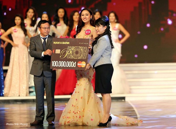 Ông Phan Đình Tân – Chủ tịch HĐQT Nam A Bank (ngoài cùng bên phải) trao giải cho Tân HHHV Việt Nam 2015 Phạm Thị Hương với giải thưởng là Thẻ Nam Á MasterCard Platinum trị giá 200.000.000 triệu đồng.[/caption]