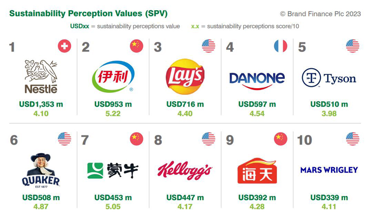 Theo Báo cáo thường niên về ngành thực phẩm và đồ uống năm 2023 của Brand Finance (công ty toàn cầu về định giá thương hiệu, có trụ sở chính tại Luân Đôn - Anh quốc), Nestlétiếp tục là thương hiệu thực phẩm có giá trị nhất thế giới, với giá trị thương hiệu được định giá lên đến 22,4 tỷ đô la Mỹ, đồng thời đứng vị trí số 1 về bền vững trong bảng xếp hạng 100 thương hiệu thực phẩm. Trong đó, giá trị nhận thức về tính bền vững của Nestlé được định giá lên đến 1,35 tỷ đô la Mỹ.