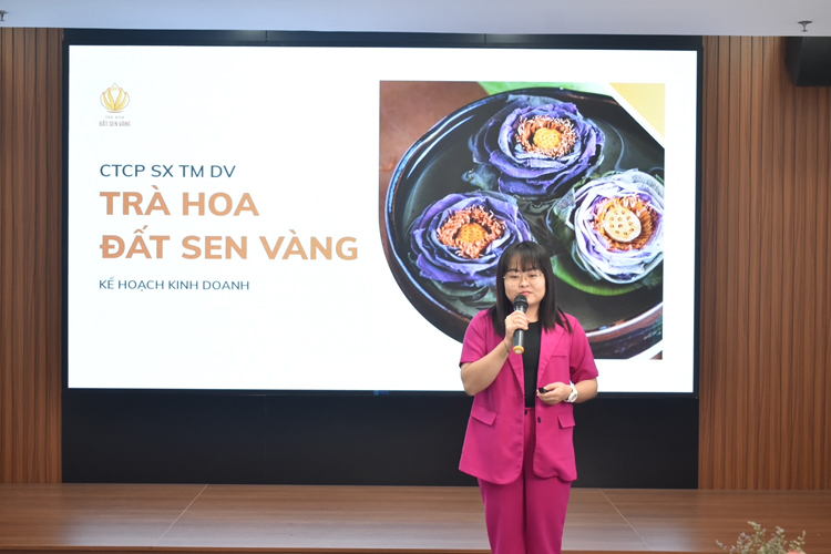 | Đại diện Startup thuyết trình về sản phẩm Trà hoa Đất Sen Vàng |