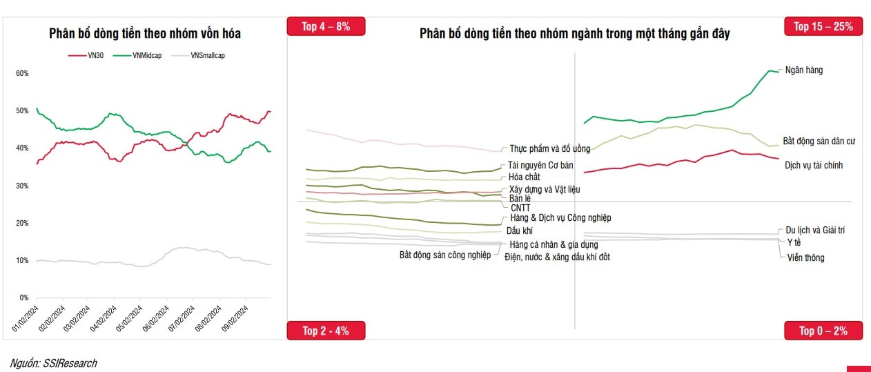 | Trong tháng 9, dữ liệu SSI ghi nhận theo quy mô vốn hóa, tỷ trọng GTGD phân bổ dành cho nhóm VN30 đang ở mức 50% - cao nhất kể từ đầu năm nhờ giao dịch mạnh hơn ở nhóm Ngân hàng và một số mã Bất động sản trụ cột. (Trong VN30, ngân hàng chiếm tỷ trọng lớn và chiếm hơn 40% vốn hóa toàn sàn HoSE) |