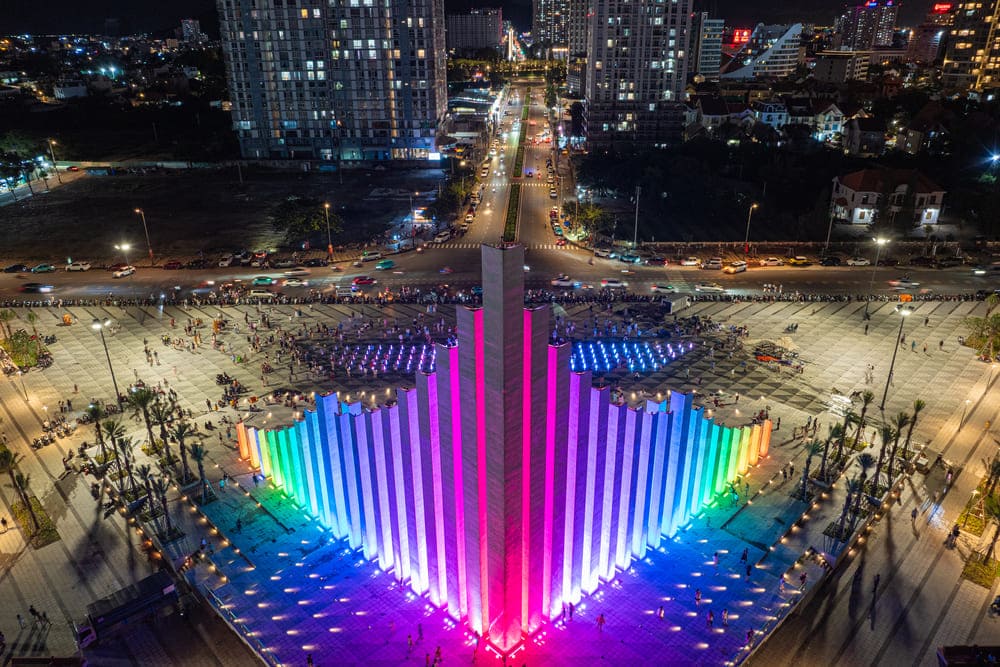 | Quảng trường và Tháp Tam Thắng lung linh sắc màu về đêm. Ảnh: Hải Triều |