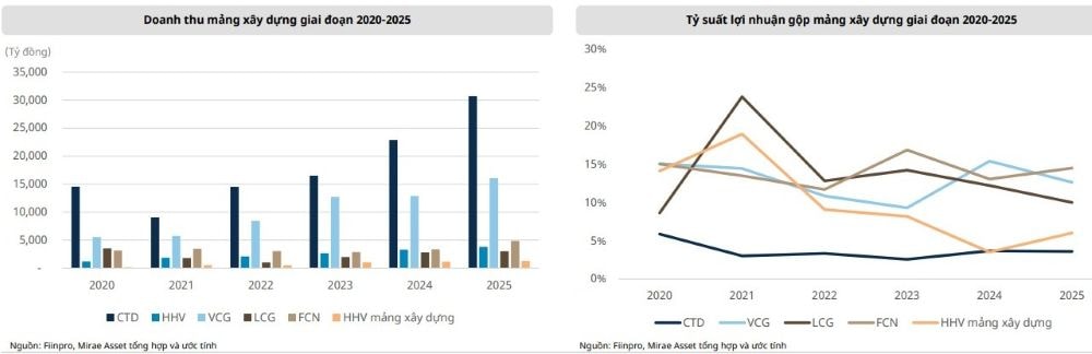 “Chất lượng tăng trưởng cho thấy có sự phân hóa rõ rệt. HHV nổi bật về khả năng tạo biên gộp cao, VCG và FCN thể hiện mức độ cân bằng tương đối giữa quy mô và hiệu quả, trong khi CTD tăng trưởng chủ yếu dựa vào mở rộng doanh thu hơn là cải thiện biên. Riêng LCG vẫn chưa cho thấy sự phục hồi đủ mạnh cả về quy mô lẫn hiệu quả gộp”, Mirae Asset đánh giá.