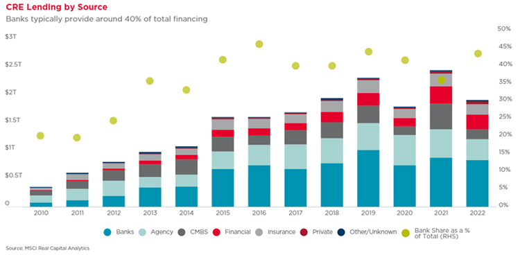 Thị trường trước đó vốn đã khó vay. Theo Khảo sát ý kiến của Cán bộ cho vay cấp cao của Fed, nhiều ngân hàng cho biết họ đang thắt chặt các tiêu chuẩn cho vay đối với các khoản vay bất động sản thương mại và kinh doanh khác, tiêu chuẩn cao nhất trong 13 năm qua. Ngoại trừ năm 2020, giai đoạn này có môi trường cho vay khó khăn nhất kể từ cuộc Đại khủng hoảng Tài chính. Kể từ đó, Chỉ số Điều kiện Tài chính của Bloomberg (tổng hợp của 10 chỉ số thị trường tài chính) đã giảm mạnh, điều này thể hiện việc tiêu chuẩn cho vay của đa số tổ chức tài chính trở nên khó khăn hơn, không chỉ riêng vay vốn ngân hàng. Nhìn chung, thị trường tài chính thắt chặt, thị trường chứng khoán suy yếu, và chênh lệch tín dụng mở rộng. Những doanh nghiệp vay bất động sản thương mại đang tìm kiếm nguồn tài chính từ các ngân hàng vừa và nhỏ cũng đối mặt nhiều thử thách.