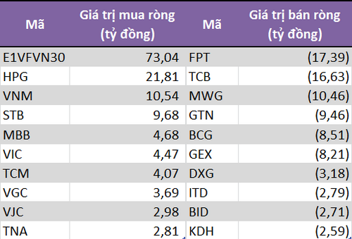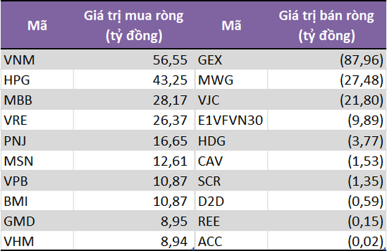 Giao dịch khối ngoại diễn ra khá tích cực khi họ mua ròng trên cả 3 sàn với tổng giá trị 55,34 tỷ đồng. Lực mua của khối ngoại tập trung vào các Bluechips như HPG (31,9 tỷ đồng), E1VFVN30 (15,15 tỷ đồ ...