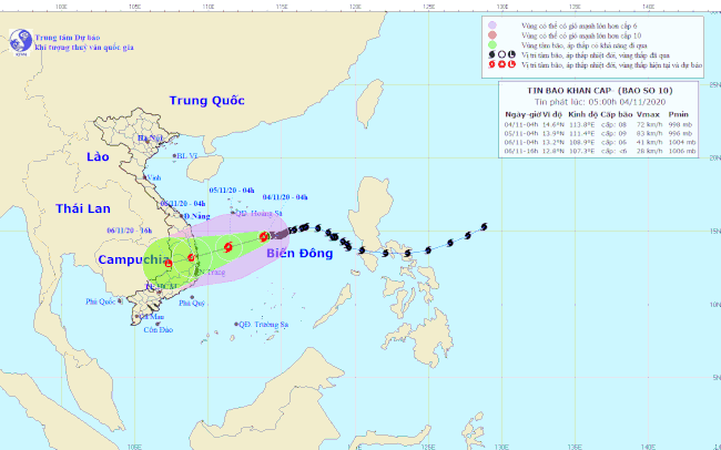 Đến 4 giờ ngày 5-11, vị trí tâm bão ở khoảng 13,9 độ Vĩ Bắc; 111,4 độ Kinh Đông, cách Quảng Ngãi đến Khánh Hòa khoảng 230km về phía Đông. Sức gió mạnh nhất vùng gần tâm bão mạnh cấp 8-9 (60-90km/giờ), ...