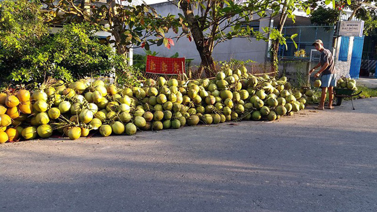 Do ảnh hưởng của dịch Covid-19 khiến thị trường tiêu thụ chậm, giá dừa liên tục sụt giảm trên 30% so với cùng kì năm ngoái.
