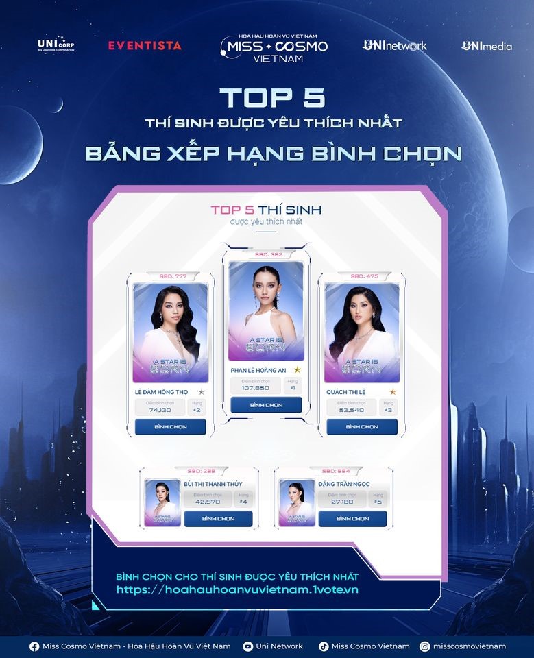 Chiến thắng Tập 2 của Truyền hình thực tế “Tôi là Hoa hậu Hoàn vũ Việt Nam”, thí sinh Phan Lê Hoàng An nhận đặc quyền nhân ba số điểm bình chọn trong vòng 48 giờ trên cổng bình chọn EVENTISTA, xuất sắ ...