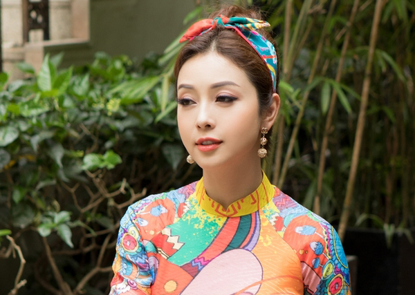 Hoa hậu diện áo dài họa tiết khi dẫn chương trình ngày xuân cùng MC Quyền Linh.