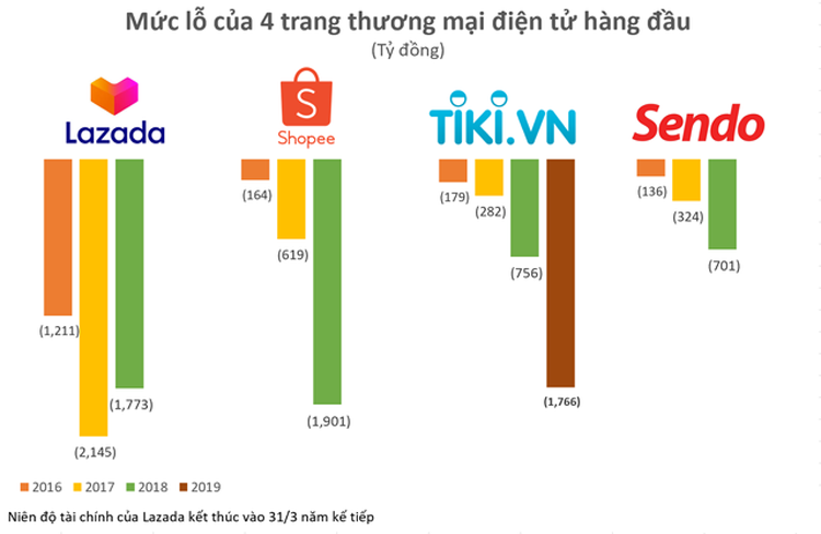 Nếu như năm 2016, mức lỗ của nhóm "Big 4" ngành thương mại điện tử chỉ có 1.700 tỷ đồng thì đến năm 2017 đã tăng gấp đôi lên 3.400 tỷ và năm 2018 tiếp tục tăng gấp rưỡi lên 5.100 tỷ đồng.