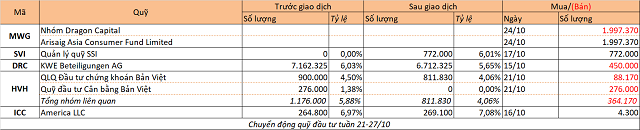 Dragon Capital sang tay gần 2 triệu cổ phiếu MWG cho quỹ tỷ đô Arisaig Asia. Quỹ thuộc SSI mua vào cổ phần SVI và trở thành cổ đông lớn từ 17/10.Quỹ Thụy Sỹ bán cổ phần DRC trong hoạt động tái cơ cấu ...
