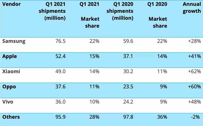 Trong quý I/2021, các hãng sản xuất di động đều ghi nhận doanh số tăng mạnh, đặc biệt là các nhà sản xuất Trung Quốc.
