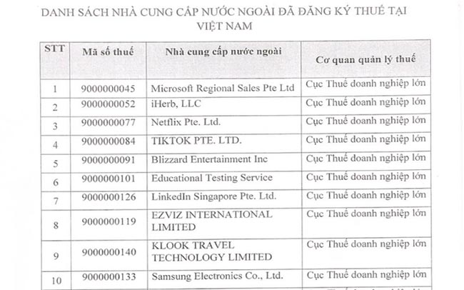 Hàng loạt nhà cung cấp nước ngoài đã đăng ký thuế tại Viêt Nam, trong đó có nhiều "ông lớn" nộp thuế lên tới hàng ngàn tỉ đồng