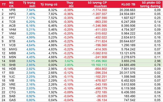 Tại rổ VN30, SHB sau khi được thêm vào danh mục sẽ chiếm tỷ trọng gần 2,84%, trong khi SSB chiếm tỷ trọng 3,62%. Với tỷ trọng trên, ước tính DCVFM VN30 ETF sẽ mua vào khoảng SHB (17,4 triệu cổ phiếu) ...