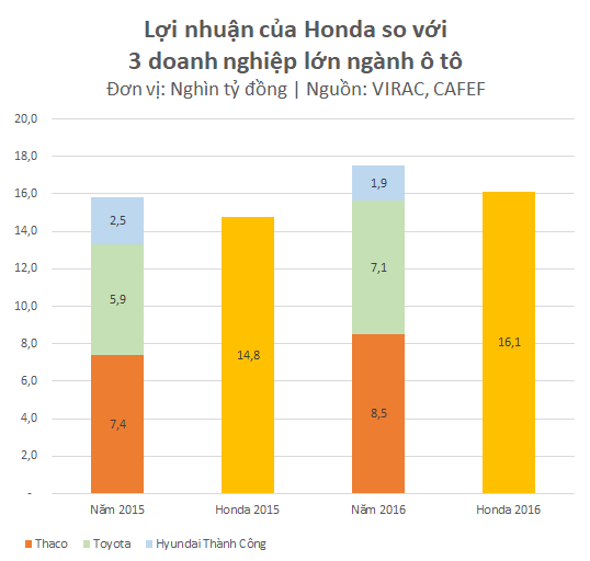 Năm 2018 Honda Việt Nam lãi trước thuế 23.448 tỷ (hơn 1 tỷ USD), lợi nhuận sau thuế đạt 19.400 tỷ, bỏ xa các đối thủ còn lại, đứng top 2 trong số các doanh nghiệp đóng thuế nhiều nhất tại Việt Nam (sa ...