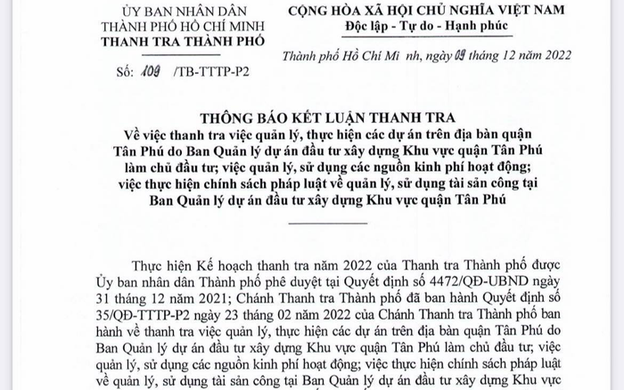 Mới đây, Thanh tra Tp.HCM ban hành Thông báo số 121/TB-TTTP-P1, kết luận thanh tra toàn diện dự án Khu nhà ở và dịch vụ chuyên gia tại Khu Công nghệ cao Tp.HCM do Công ty Cổ phần Thương mại - Dịch vụ ...