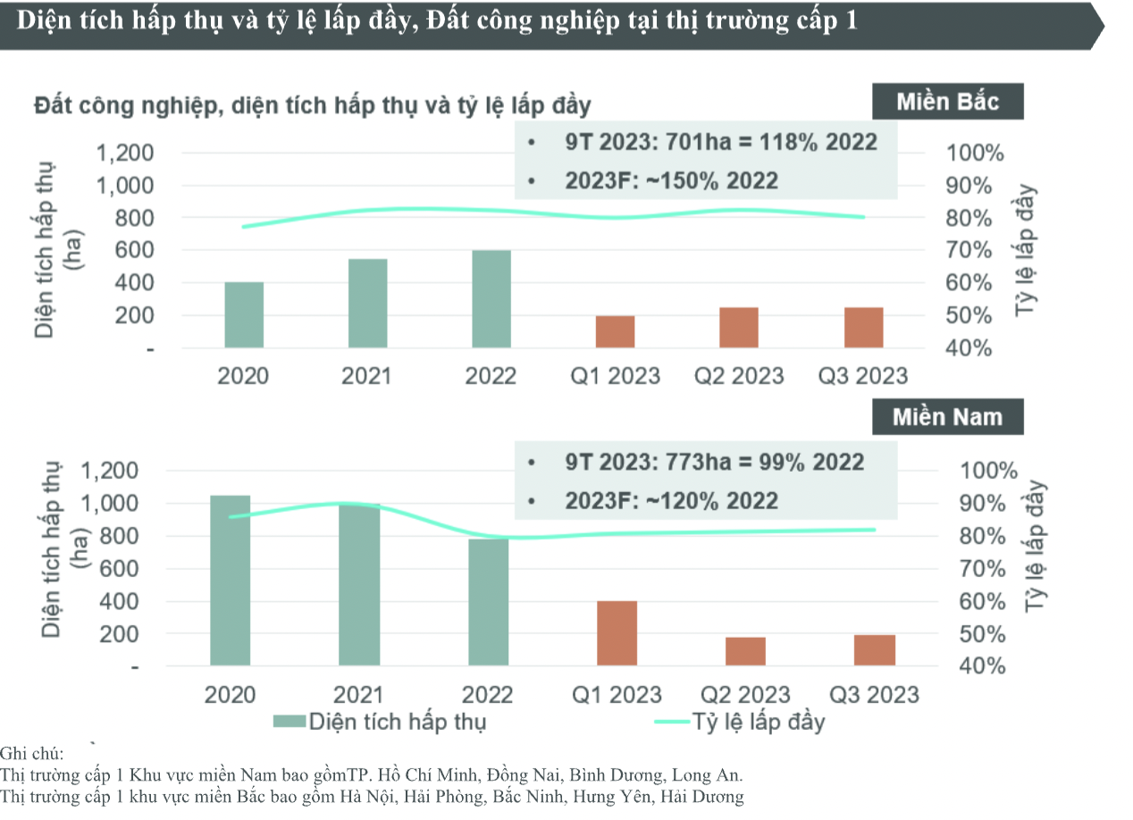 Tại thị trường công nghiệp miền Nam, tỷ lệ lấp đầy tại các khu công nghiệp trung bình đạt 81,9%. Tỷ lệ hấp thụ đất công nghiệp trong Quý 3 đạt hơn 190 ha, tăng 5,9% so với quý trước, tính chung 9 tháng đầu năm 2023 đạt hơn 770 ha, gần bằng mức hấp thụ cả năm 2022.