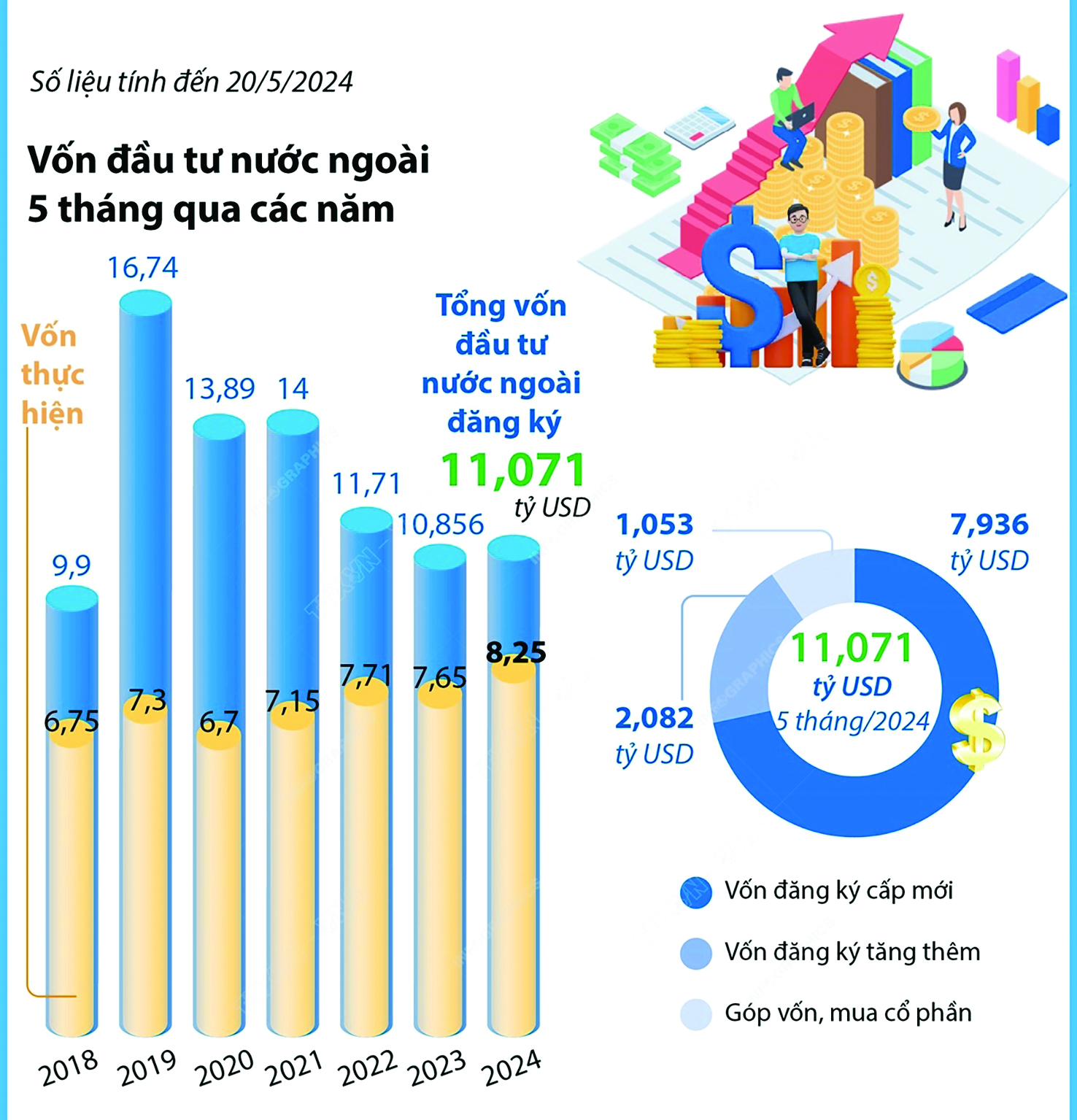 | 5 tháng đầu năm 2024, tổng vốn đầu tư nước ngoài đăng ký vào Việt Nam đạt hơn 11,07 tỷ USD. Nguồn: Bộ KH-ĐT, TTXVN |