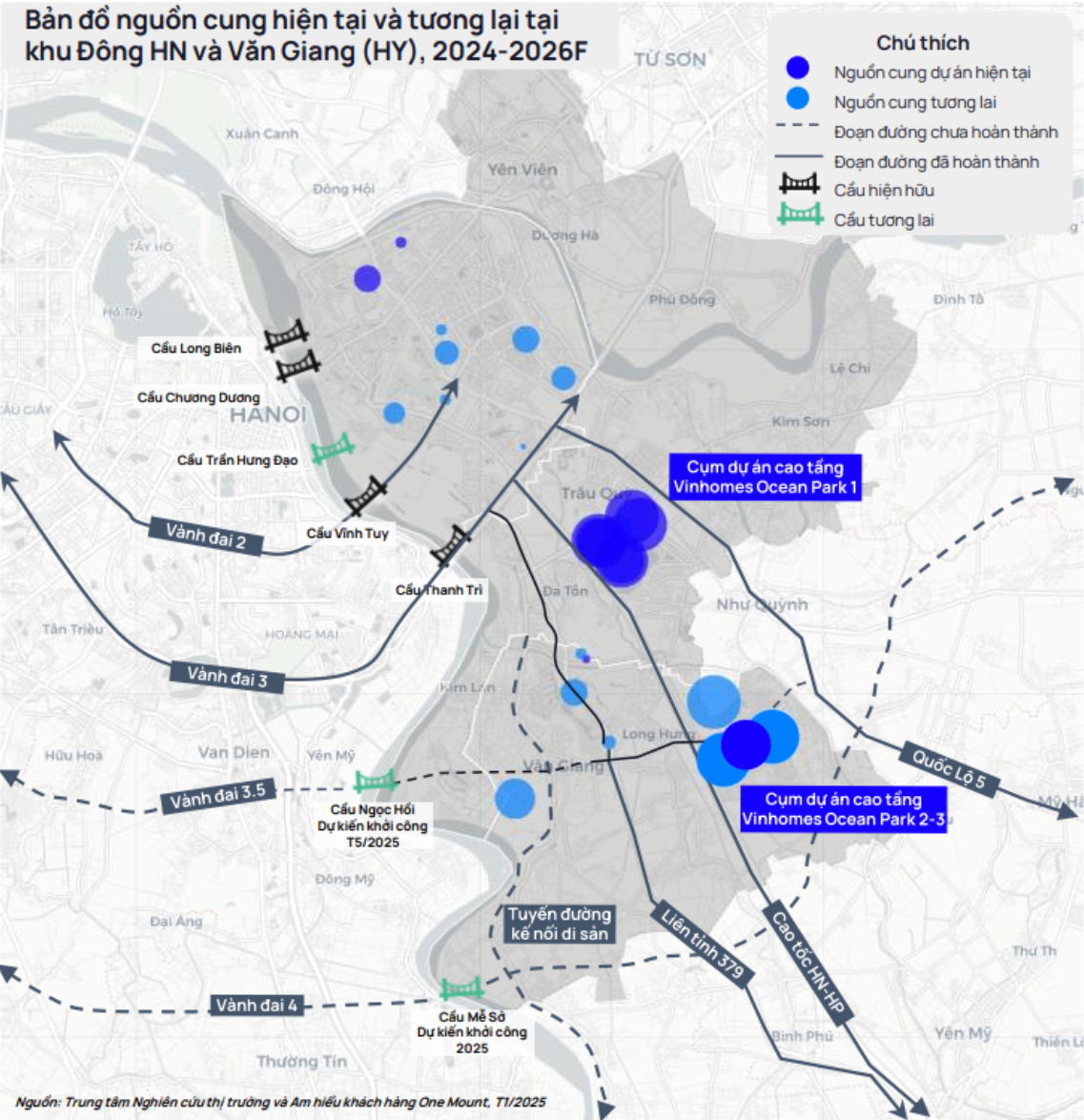Theo chia sẻ từ Trung tâm Nghiên cứu thị trường và Am hiểu khách hàng One Mount, nguồn cung khu Đông Hà Nội chủ yếu sẽ tập trung tại 2 đại đô thị hiện hữu Ocean City và Ecopark. Các đại đô thị này được đầu tư đồng bộ và hưởng lợi lớn từ các dự án hạ tầng trọng điểm đã, đang và sẽ triển khai trong năm 2025 như vành đai 3.5, vành đai 4, đường liên tỉnh 379, cầu Mễ Sở và cầu Hồng Hà.
