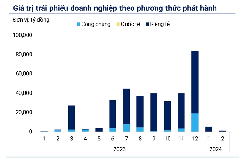 Ghi nhận chung cho 2 tháng đầu năm, báo cáo trái phiếu của WiResearch thống kê, lũy kế từ đầu năm cho thấy giá trị trái phiếu phát hành riêng lẻ đạt 6.143 tỷ đồng, chiếm 75,5%. Phương thức phát hành ra công chúng chỉ chiếm 24,5% tổng giá trị. Trong khi so với năm 2023, chỉ riêng 2 tháng đầu năm, tổng giá trị trái phiếu được huy động qua phương thức phát hành công chúng chiếm tới hơn 75%.