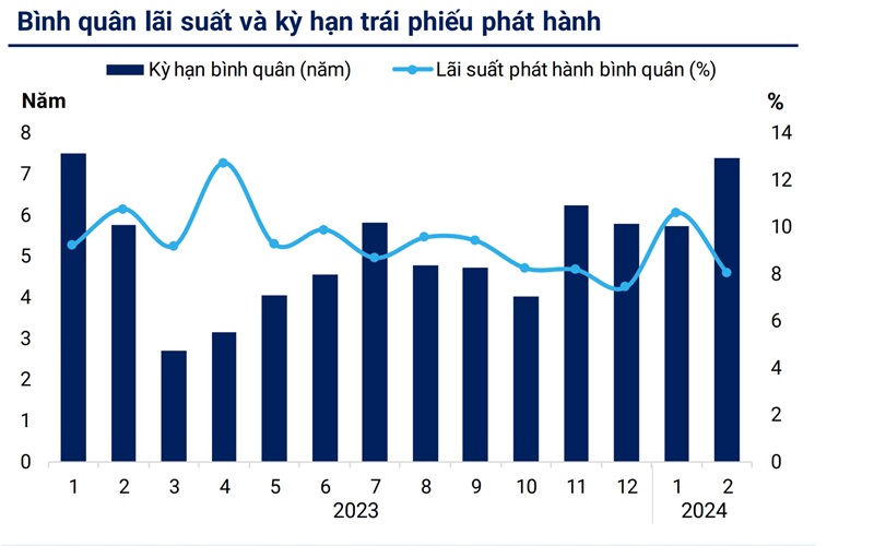 Đáng chú ý, các doanh nghiệp thực hiện phát hành trái phiếu mới tháng 2 chủ yếu nằm ở kỳ hạn trung và dài hạn. Trung bình kỳ hạn phát hành đạt 7,4 năm, trong khi đó mức lãi suất phát hành bình quân (8,05%) giảm hơn hẳn so với tháng trước đó và so với cùng kỳ (10,77%). Điều này cho thấy chính sách nới lỏng tiền tệ, mức lãi suất cho vay/ tiền gửi ở mức thấp và mức lãi suất trái phiếu Chính phủ giảm mạnh so với cùng kỳ hỗ trợ mức nền lãi suất của các tài sản tài chính như trái phiếu, nhóm chuyên gia WiReserch đánh giá.