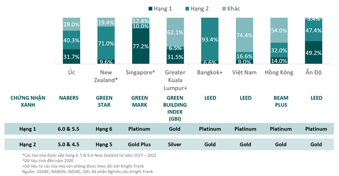 Theo một nghiên cứu được Knight Frank công bố gần đây, căn cứ trên cơ sở dữ liệu về các văn phòng xanh tại khu vực Châu Á – Thái Bình Dương, mặc dù vẫn còn xếp sau nhiều quốc gia láng giềng về chứng nhận văn phòng Hạng 1 và Hạng 2, nhưng có rất nhiều dấu hiệu cho thấy Việt Nam đang khẩn trương triển khai, áp dụng các biện pháp xanh trong những năm sắp tới.