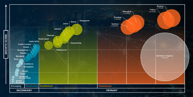 Theo Báo cáo Trung tâm Dữ liệu Châu Á Thái Bình Dương nửa đầu năm 2023 mới nhất của Cushman & Wakefield, năm thành phố: Bắc Kinh, Thượng Hải, Singapore, Sydney và Tokyo chiếm 62% công suất hoạt động của tất cả trung tâm dữ liệu trên toàn Châu Á Thái Bình Dương; trong đó Sydney, Tokyo, Bắc Kinh và Thượng Hải sẽ trở thành nhóm thành phố có công suất hoạt động vượt qua mức 1 Gigawatt (GW) trong 2,3 năm tới. Các thị trường mới nổi cũng đang phát triển nhanh chóng với Indonesia, Malaysia, Philippines và Thái Lan đều đang trên đà tăng trưởng tốt trong vòng 5 đến 7 năm tới.