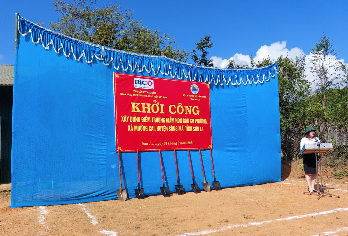 | Đại diện Tổng Công ty Bảo hiểm BIDV (BIC) và Bộ chỉ huy Bộ đội biên phòng tỉnh Sơn La khởi công xây dựng điểm trường mầm non Co Phường, thuộc Trường mầm non Hoa Đào, xã Mường Cai, huyện Sông Mã, tỉnh Sơn La |