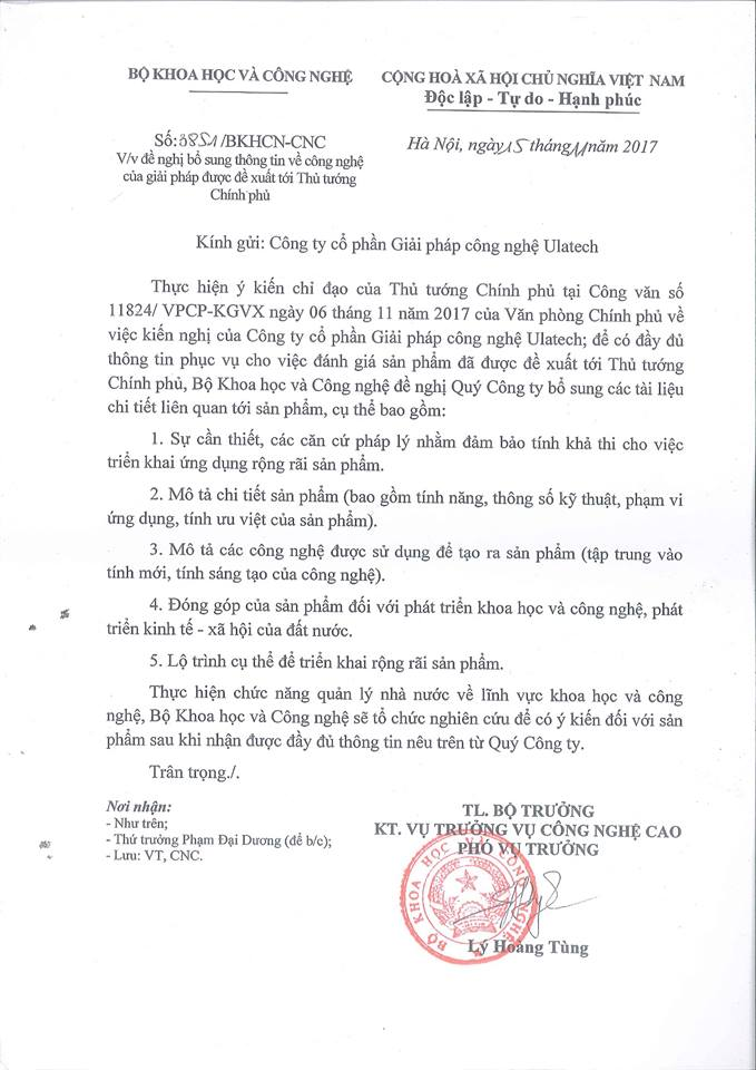 Văn bản Bộ KHCN yêu cầu Công ty Ulatech bổ sung các tài liệu chi tiết liên quan tới sản phẩm ứng dụng đặt xe ULA.[/caption]