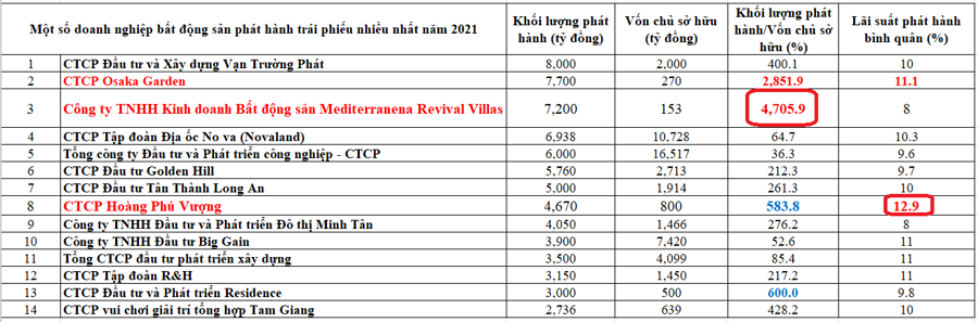 Trong danh sách này, Công ty cổ phần Hoàng Phú Vương đã phát hành 4.670 tỷ đồng, gấp 5,8 lần vốn chủ sở hữu, CTCP Osaka Garden phát hành khối lượng trái phiếu 7.700 tỷ đồng, gấp 28,5 lần vốn chủ sở hữu. Đặc biệt, Công ty TNHH Kinh doanh bất động sản Mediterranena Rvival Villas phát hành tới 7.200 tỷ đồng, trong khi vốn chủ sở hữu chỉ vỏn vẹn 153 tỷ đồng, tức phát hành khối lượng trái phiếu gấp 47 lần vốn.