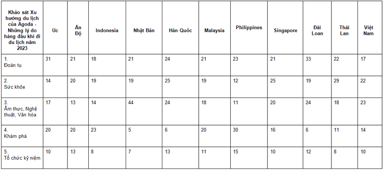 Khảo sát của Agoda được hợp tác thực hiện bởi YouGov từ ngày 8 đến ngày 16 tháng 7 năm 2022, với hơn 10.000 du khách từ 18 tuổi trở lên từ khắp các quốc gia như Australia, Singapore, Malaysia, Indonesia, Thái Lan, Ấn Độ, Philippines, Nhật Bản, Việt Nam, Đài Loan, Hàn Quốc và Mỹ.