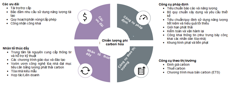 Nghiên cứu của JLL cho thấy rằng các thành phố có khả năng thành công nhất trong việc triển khai phi carbon hóa sẽ là các thành phố cân bằng quy định, ưu đãi, đổi mới và thúc đẩy. Một số thành phố được kêu gọi áp dụng các phương pháp tiếp cận đổi mới của mình để giảm thiểu lượng phát thải từ các tòa nhà, chẳng hạn như Quy hoạch Tổng thể Phát triển Công trình Xanh của Singapore trong đó đặt mục tiêu xanh hóa 80% tòa nhà vào năm 2030. Trong khi đó, Tokyo đã triển khai một chương trình mua bán phát thải khuyến khích các chủ sở hữu tòa nhà cắt giảm lượng phát thải và sử dụng năng lượng tái tạo.