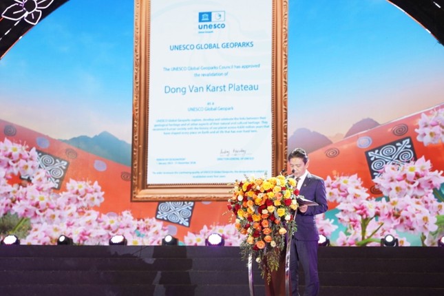 Lễ đón nhận danh hiệu thành viên mạng lưới Công viên địa chất toàn cầu UNESCO Cao nguyên đá Đồng Văn lần thứ ba được tổ chức tại thị trấn Đồng Văn tối 27/10.
