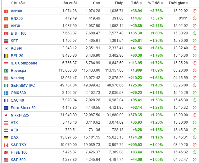 Khép lại phiên giao dịch 2/11 (theo giờ Việt Nam), chứng khoán trong nước đang là thị trường có chỉ số đại diện tăng mạnh nhất thế giới (thống kê: investing.com).