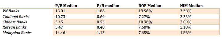 Theo ông Nguyễn Trí Hiếu - Chuyên gia tài chính ngân hàng, so sánh các ngân hàng niêm yết của Việt Nam trong rổ VN30 như VCB, CTG, VPB, MBB, HDB, BIDV với các nước Indonesia, Malaysia, và Thái Lan, một số chỉ số định giá cơ bản cho thấy những ngân hàng này đang ở mức trung bình hoặc thấp hơn ở các chỉ số P/E. Tuy nhiên với thị trường tăng nóng như hiện nay, nhà đầu tư phải cân nhắc.