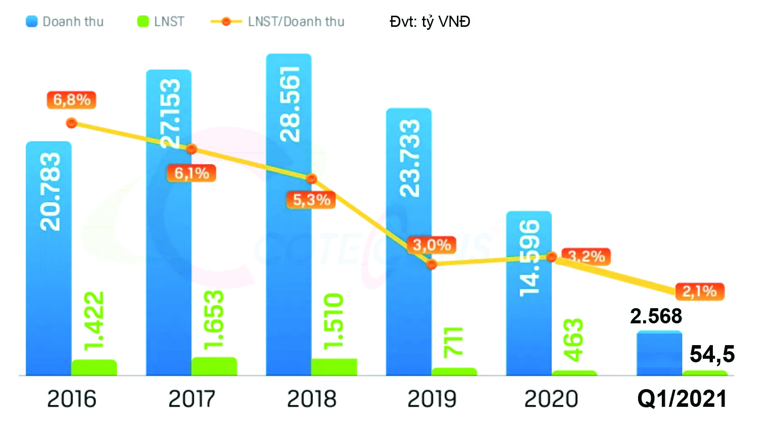 Thứ hai, lãi ròng quý I/2021 tiếp tục giảm mạnh chỉ còn 54,5 tỷ đồng. Tác động mạnh của giá nguyên vật liệu xây dựng đối với nhà thầu được cho là nguyên nhân chính dẫn đến kết quả này.