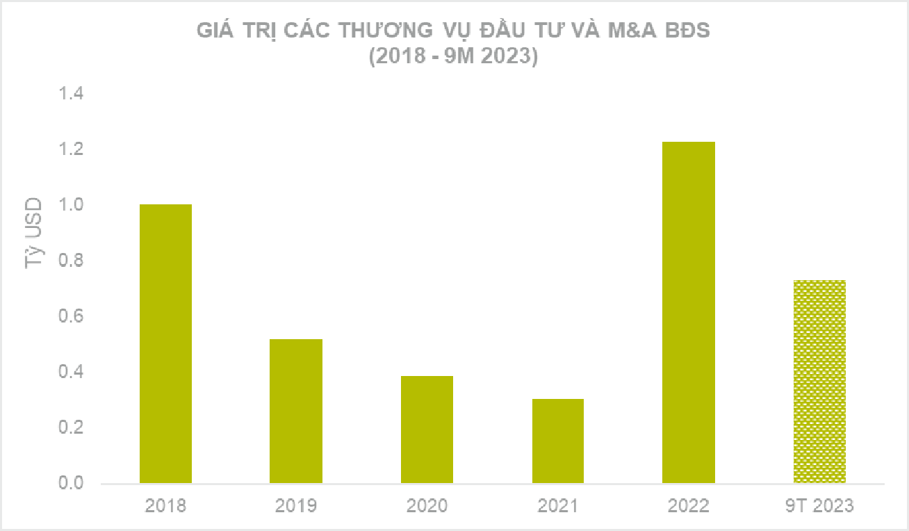 Tổng giá trị giao dịch đầu tư và M&A BĐS tạm tính trong 9 tháng đầu năm 2023 đạt 729 triệu USD, giảm 33% do so với cùng kỳ do thiếu thương vụ có giá trị lớn (Năm 2022 có thương vụ mua lại dự án văn phòng Capita Place trị giá 500 triệu USD). Trong đó, dẫn đầu là các nhà đầu tư gốc Á từ Singapore, Malaysia, Đài Loan, Hàn Quốc với lợi thế về vị trí địa lý, sự tương đồng về văn hóa, và am hiểu pháp luật địa phương.