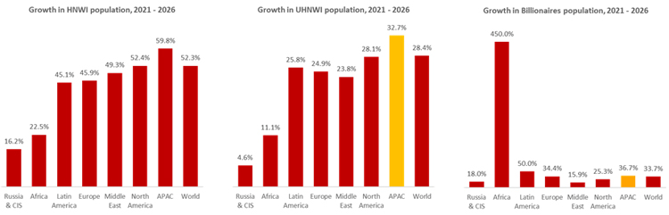Knight Frank dự báo lượng dân số siêu giàu toàn cầu sẽ tăng thêm 28%, trong đó Châu Á và Châu Đại Dương có mức tăng trưởng cao nhất (33%), kế tiếp là Bắc Mỹ (28%) và Mỹ Latin (26%).