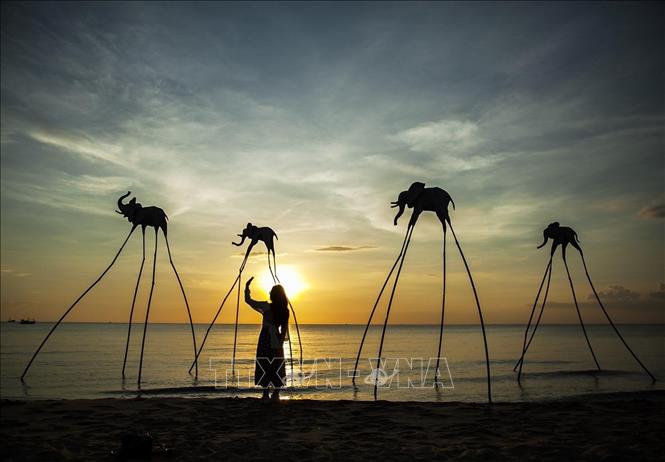 | Du khách trải nghiệm không gian hoàng hôn trên Bãi Trường, nơi được cho là địa điểm ngắm hoàng hôn đẹp nhất Việt Nam. Ảnh: Hồng Đạt/TTXVN |