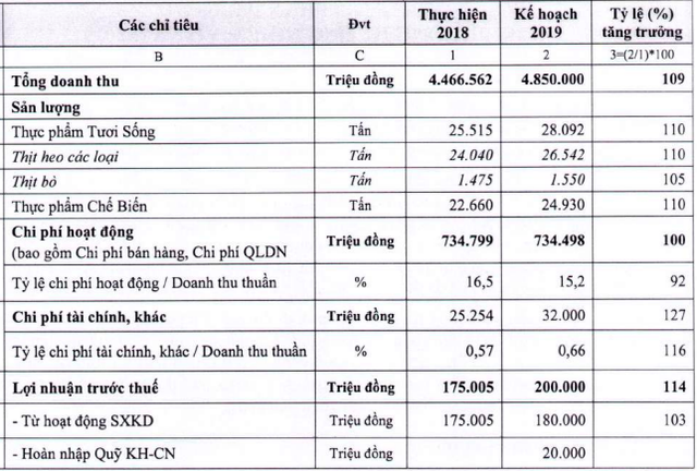 Theo đó, kết quả kinh doanh đạt được, tổng doanh thu năm 2018 đạt 4.466 tỷ đồng, tăng 15% so với năm 2017 nhưng cũng chỉ mới hoàn thành 97% kế hoạch được giao. Trong cơ cấu hàng hóa của công ty, sản lượng thịt tươi sống đạt 25.515 tấn, thực hiện được 85% kế hoạch, trong đó có 24.040 tấn thịt heo và 1.475 tấn thịt bò. Còn thực phẩm chế biến đạt 22.660 tấn, vượt 4% kế hoạch được giao.
