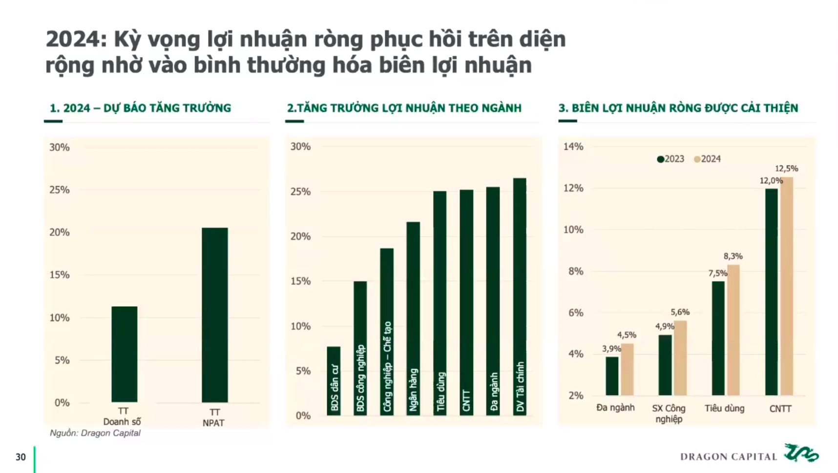 Về tăng trưởng lợi nhuận, cổ phiếu vốn hoá lớn dự kiến dẫn đầu xu hướng hồi phục và hai quý cuối năm 2023 dự kiến đạt 25% do mức nền thấp trong cùng kỳ năm trước. Đặc biệt, Dragon Capital hạ dự báo tăng trưởng lợi nhuận năm 2024 từ 24% xuống còn 16-20% do còn nhiều biến số khó lường. Tuy nhiên, lợi nhuận năm 2024 vẫn tăng trưởng hai con số nhờ vào bình thường hoá biên lợi nhuận.