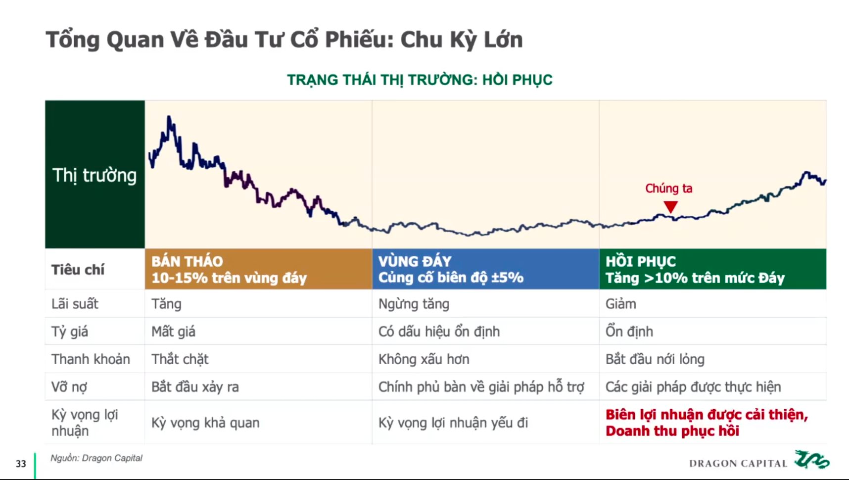 Theo Giám đốc Dragon Capital, thị trường chứng khoán vận động theo chu kỳ và khi nắm được chu kỳ chúng ta có thể né được những cú giảm 5-10% cũng như những cú cắt ngay đáy. Lạm phát và lãi suất vẫn chưa chạm đáy, tăng trưởng đã đi qua đáy. Triển vọng chứng khoán về mặt trung hạn khá ổn định, dù điều đó không có nghĩa mua cổ phiếu gì cũng có thể sinh lời, song trong chu kỳ này rất khó để VN-Index giảm trên 12-14%.