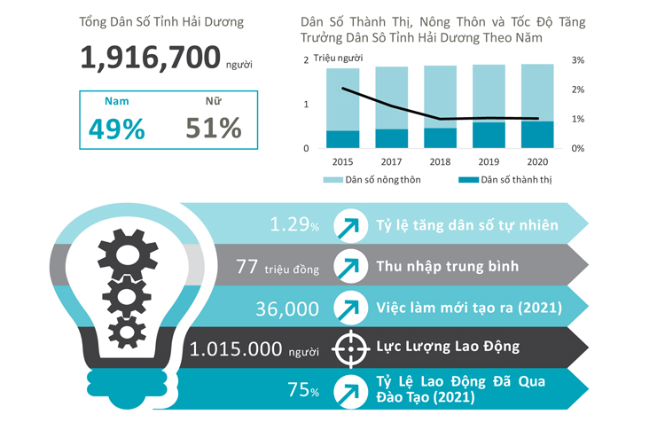 Chỉ cách thủ đô Hà Nội 57km, Hải Dương được xem là tỉnh có tiềm lực và dư địa phát triển kinh tế lớn. Nằm tại vùng kinh tế trọng điểm Bắc Bộ, tiếp giáp vành đai kinh tế Bắc Bộ với lượng dân số chỉ đứng sau Hà Nội và Hải Phòng, tỉnh Hải Dương đảm bảo nguồn nhân lực cho các dự án đầu tư đang hoạt động.