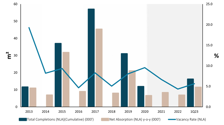Quy mô thị trường văn phòng hạng A TP.HCM tại khu vực trung tâm CBD* chưa có sự biến động trong hai năm qua kể từ khi Tòa nhà Hữu Nghị hoàn thành, tòa nhà hạng A mới nhất ra mắt năm 2020. Đến Quý 1 năm 2023, tổng nguồn cung hạng A tại khu vực trung tâm đạt 308.325 m2 (tính trên diện tích thuê thuần). Nguồn cung hạn chế kéo theo tỷ lệ trống của các tòa nhà luôn duy trì ở mức một con số, cụ thể là mức 5,6% vào cuối quý này.
