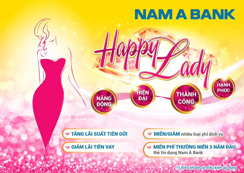 Phụ nữ hiện đại vừa đảm nhiệm tốt vai trò trong xã hội vừa chu toàn cuộc sống gia đình, Nam A Bank ra đời gói sản phẩm “Happy Lady” nhằm mang đến món quà thiết thực sẻ chia bớt lo toan, giúp phụ nữ hoàn thành những kế hoạch tài chính trong tương lai. Theo tìm hiểu, “Happy Lady” là gói sản phẩm kết hợp giữa Tiền gửi tiết kiệm, Tiền vay, Tài khoản thanh toán, Gói tài khoản Tối ưu, Gói Combo và Thẻ tín dụng quốc tế do Nam A Bank phát hành. Khi khách hàng nữ sử dụng các sản phẩm dịch vụ tại Nam A Bank gồm: tiền gửi tiết kiệm, sản phẩm tiền vay, tài khoản thanh toán, sản phẩm dịch vụ khác, tùy vào giá trị giao dịch sẽ được hưởng các chính sách ưu đãi đặc quyền tương ứng với 4 gói Năng Động, Hiện Đại, Thành Công và Hạnh Phúc.