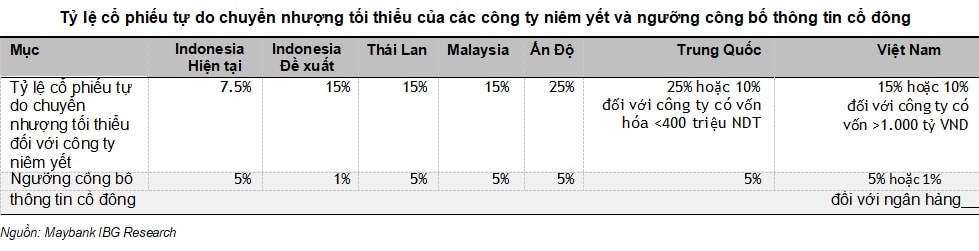 Theo ông Huy, tuy nhiên, Chứng khoán Maybank cho rằng rủi ro này là trong tầm kiểm soát. Mặc dù các ngưỡng công bố sở hữu cổ đông tại Việt Nam nhìn chung đã tương đối phù hợp với thông lệ quốc tế, thậm chí nghiêm ngặt hơn trong lĩnh vực ngân hàng, yêu cầu tối thiểu về tỷ lệ cổ phiếu tự do chuyển nhượng chỉ thấp hơn nhẹ so với các quốc gia lân cận. Quan trọng hơn, khi nâng hạng thị trường là một ưu tiên kinh tế hàng đầu của lãnh đạo Việt Nam, các nhà phân tích tin rằng Chính phủ sẽ thực hiện các bước cần thiết để xử lý mọi quan ngại từ các nhà cung cấp chỉ số và nhà đầu tư toàn cầu trong thời gian tới.