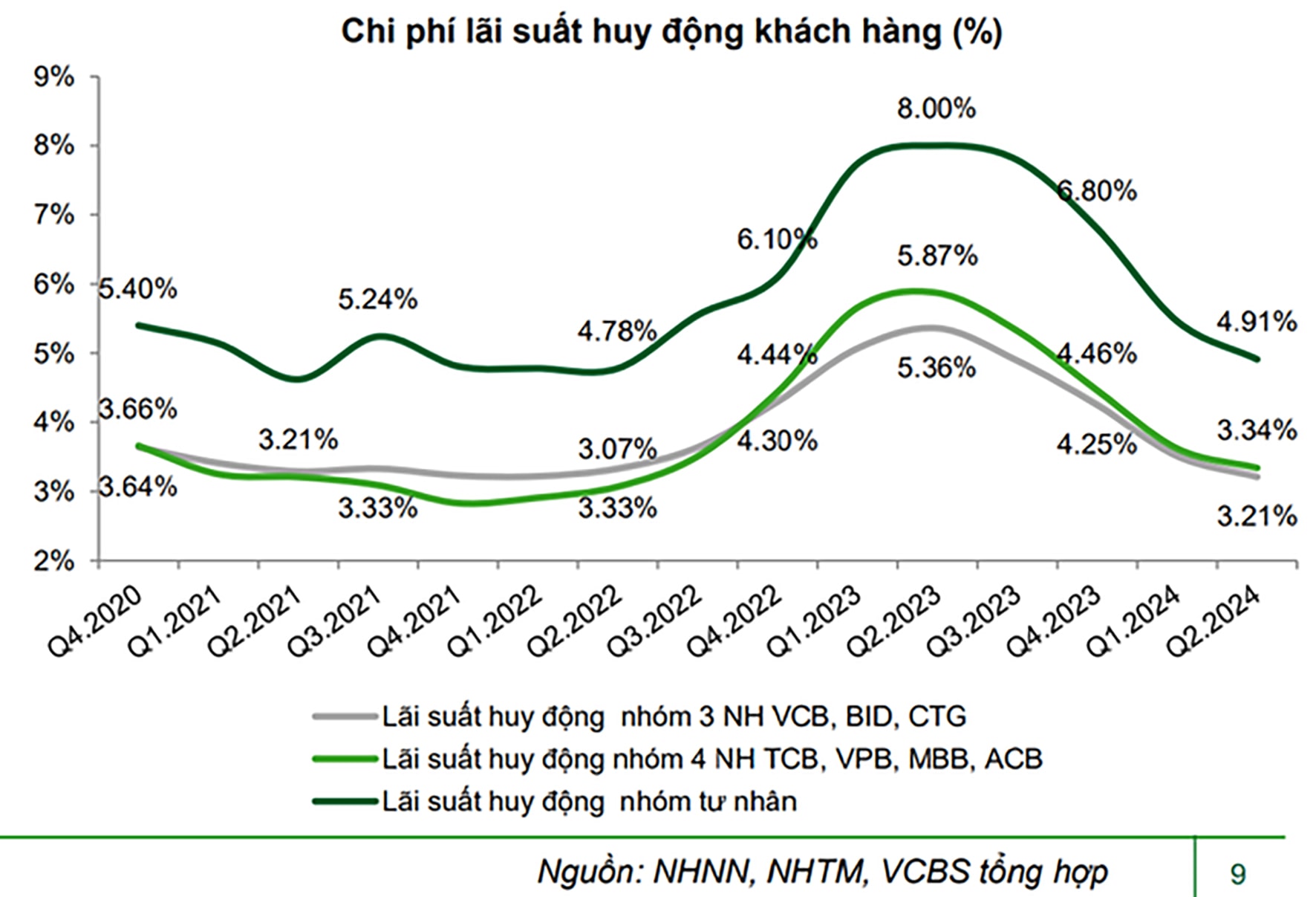 | Lãi suất huy động của một số nhóm ngân hàng. Nguồn: NHNN, NHTM, VCBS |