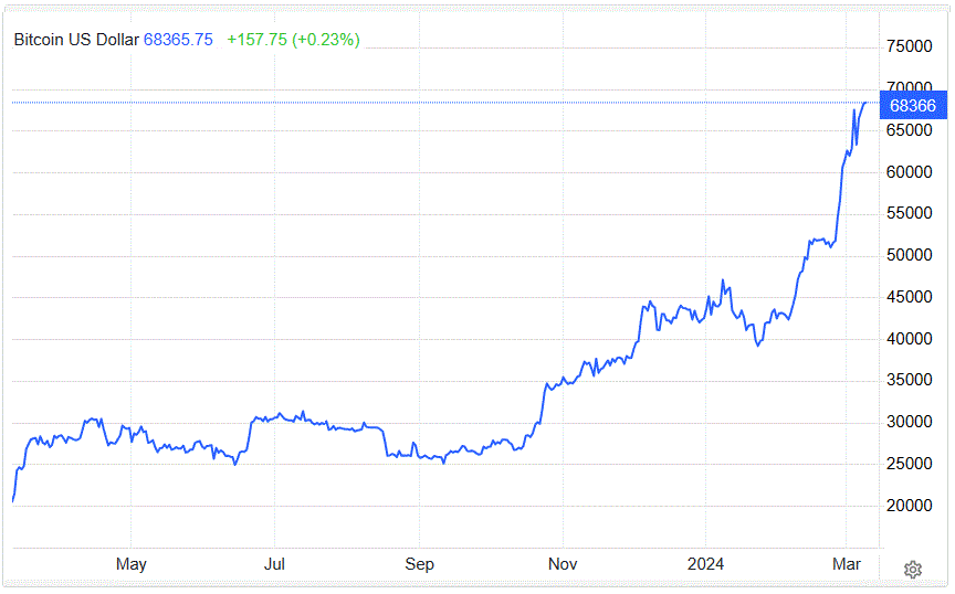 Hôm thứ Sáu (8/3), Bitcoin có thời điểm đạt 70.105 USD, khi các nhà đầu tư tiền điện tử kỳ vọng lãi suất trên toàn cầu sắp giảm, nhất là ở Mỹ.